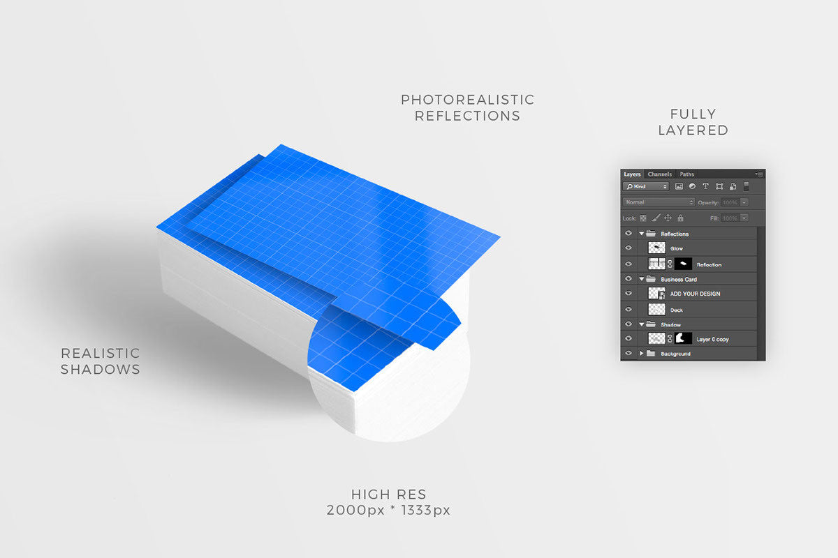 If you're traveling through the world of graphic design, you may have noticed that many customers need business cards. We have created these mockups by photographing real white business cards in a light tent. Most of the shadows are extracted from real hi-res photos to bring that smooth real shadow. We’ve also added a realistic reflections to make it look like it would reflect a real window. Just change them how you want. We’ve made this with Photoshop CC and added a fully-changeable grey color background so you’ll be on the safe side if you’ve got it too. We hope this makes your day! If you need more of this quality business card mockups, check out the higher quality premium product: 32 Clean Business Card Mockups.